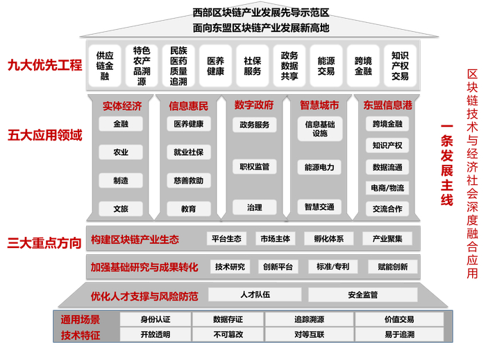 围绕上述建设目标,广西提出要以区块链技术与经济社会深度融合应用为一条发展主线,以赋能实体经济、推进信息惠民、增强数字政府、提质智慧城市、支撑中国-东盟信息港为5大应用领域,以构建区块链产业生态、加强基础研究与成果转化、优化人才支撑与风险防范为3大重点方向,打造南宁、桂林双核心,构建区块链产业特色发展轴和特色应用发展区,优先突破供应链金融、特色农产品溯源、民族医药质量追溯、医养健康、社保服务、政务数据共享、能源交易、跨境金融、知识产权交易等9大领域应用,囊括36个重点工程。