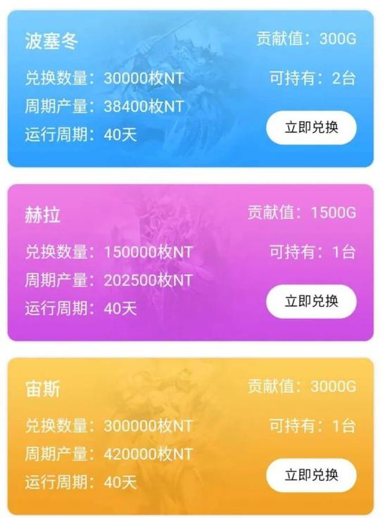 以99pool上最高等级的矿机“宙斯”为例,该矿机价格为30万NT,40天后可产出42万枚NT。以此计算,其年化收益率为365%。
