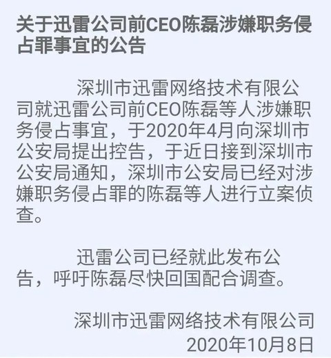 10月8日,迅雷发布公告,称就迅雷公司前CEO陈磊等人涉嫌职务侵占事宜,于2020年4月向深圳市公安局提出控告,近日接到通知,深圳市公安局已对涉嫌职务侵占罪的陈磊等人进行立案侦查。迅雷喊话陈磊,让他尽快回国配合调查。