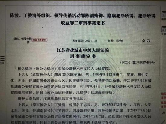 盐城经济技术开发区法院2020年9月22日作出(2020)苏0991刑初44号刑事判决。以组织、领导传销活动罪判处陈波有期徒刑十一年,并处罚金人民币六百万元;丁赞清等十三人分别以组织、领导传销活动罪被判处八年八个月以下有期徒刑,并处罚金。另有陈滔以掩饰、隐瞒犯罪所得罪,被判处有期徒刑四年十个月,并处罚金人民币六十万元。
