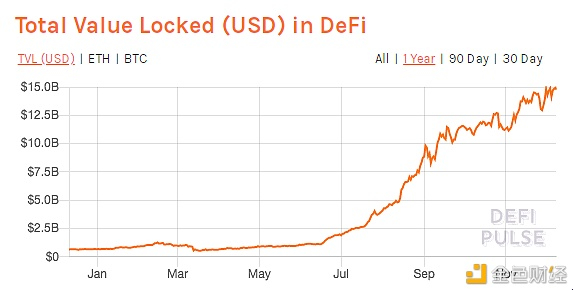 到9月中旬,在以太坊上运行的DeFi协议的TVL就超过了100亿美元。同时,Metmask(狐狸钱包)的月活跃用户也达到100万。如今,DeFi的TVL已经接近150亿美元。