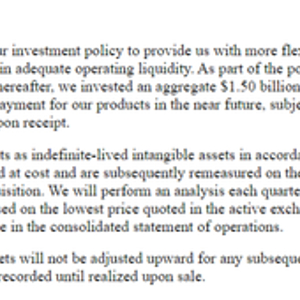 根据特斯拉2020年财报原文显示——【购买的比特币根据会计准则汇编(ASC)350条,无形资产–商誉和其他将数字资产记为无期限无形资产。数字资产最初按成本入账,之后在扣除自购买以来产生的任何减值损失在合并资产负债表上重新计量。我们将每季度进行一次分析以识别减值。如果该数字资产的账面价值超过了该期间活跃交易所报价的最低价格的公允价值,我们将在合并业务表中确认减值损失。】