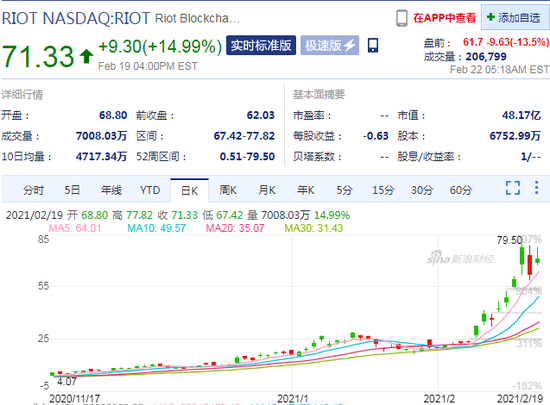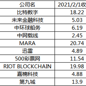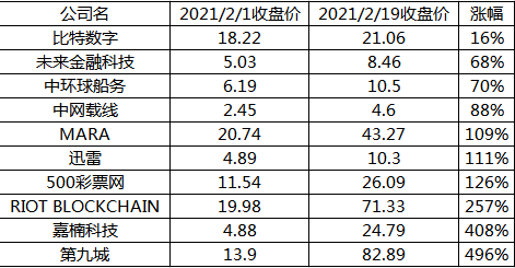 RIOT BLOCKCHAIN ,价廉物美 精打细算的北美“矿王”,2月份涨幅近3倍。Riot Blockchain Inc.是一家总部位于美国科罗拉多州的比特币挖矿公司,专注于比特币挖掘,通过参与比特币的共识系统,通过工作量证明挖掘区块获得比特币奖励,从而维护比特币网络的正常运行。其目标是成为北美最大、成本最低的比特币生产商之一,其前身是一家小型制药公司,近年来也是借比特币的“东风”实现了业务转型。