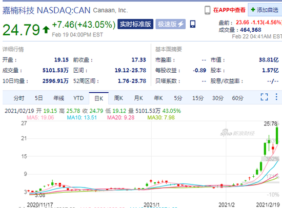 嘉楠科技,矿机新星 比特币领域的“卡特皮勒”,仅在2月份股价就从4.7美元涨至25美元,涨幅高达近5倍。