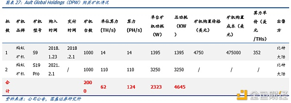 “总算力/总功耗”指标则反映出公司所购矿机的性能,其值越大,则同等功耗水平下,算力越高。此项数据披露并不完整,据已有数据可以看出,Ault Global Holdings的矿机性能较好。