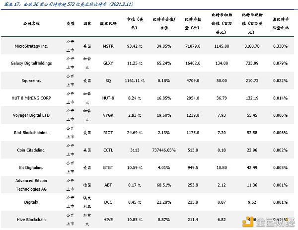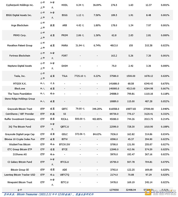 这些公司共分为三种类型:公开上市交易、私人持有、类ETF持有人。其中,持有比特币最多的是美国的Grayscale Bitcoin Trust,高达64.9万个,占比特币总量的3%,价值达360亿美元;上市公司中持有比特币最多的是美国的MicroStrategy,高达71079个(占比特币总量的0.34%),价值达39亿美元。
