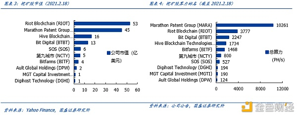 根据我们的统计,2021年2月18日,挖矿股除Riot Blockchain外,市值均在50亿美元以下,除Marathon Patent Group拥有的算力在1万PH/s(相当于10EH/s)以上,其他均不到5EH/s。
