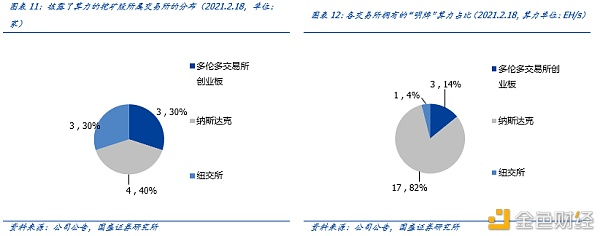 在矿机公司所属的交易所方面也有“二八”现象,根据我们的统计,热衷于购买比特币及其矿机的上市公司的上市地多为美、加两地(并不意味着是当地公司),其中,披露了算力的10家挖矿股有3家的上市地是多伦多交易所创业板,4家在纽交所,3家在纽交所,按算力占比统计,纳斯达克拥有的算力最多,接近82%。例如,占据挖矿股“半壁江山”的Marathon Patent Group即为美国公司,这主要受制于地方政府对BTC的态度。