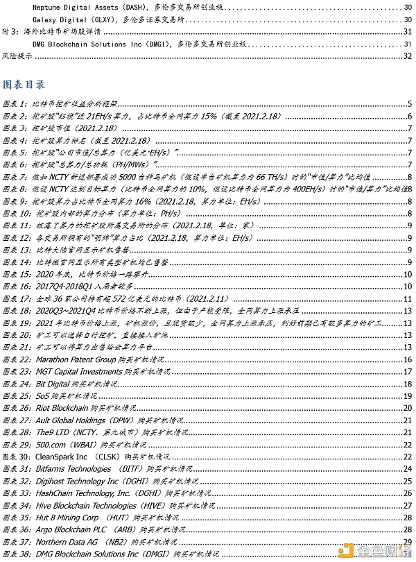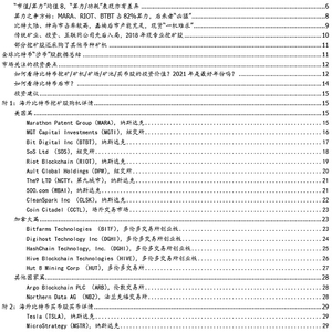 投资建议。建议关注:1)挖矿股:MARA、第九城市、RIOT、BTBT。2)矿机股:嘉楠科技、亿邦国际、英伟达等。3)矿场股:DMGI;4)矿池股(500.com);5)买币股:Microstrategy、特斯拉、GBTC等;6)交易所:火币科技、欧科云链;7)其他:中嘉博创、雄岸科技等。