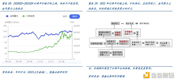 背景:币价上涨,矿机芯片产能受限,利好前期已有较多算力的机构。币价上涨对挖矿收入的影响并非线性的“币价涨—收入增”,要注意的是,1)收入端,矿工可挖得的比特币数量与“自有算力/全网算力”正相关。币价上涨时,理论上全网算力增加,但去年以来,矿机芯片产能受半导体需求紧张,全网算力增加缓慢,因此矿工“自有算力/全网算力”不减,即矿工可挖得的比特币数量不减,利好矿工;3)成本端,由于矿机厂商以回本周期定价,币价上涨时,回本周期缩短,矿机提价,挖矿成本上升,挖矿净收入增加承压,利空矿工。因此,我们认为,短期内挖矿形势利好前期已有较多算力储备的机构,而矿机厂商加码挖矿也将成为行业有力竞争者。