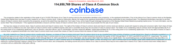 此前,根据彭博的报道,Coinbase在纳斯达克私人市场最后一周的市场估值大约为900亿美元;根据招股书,2021年第一季度(至2021年3月15日)的每股交易量加权平均价格为343.58美元。更有传言Coinbase以373美元/股在纳斯达克私人市场出售了127000股,以公司目前总股本,相当于估值达到1002亿美元。
