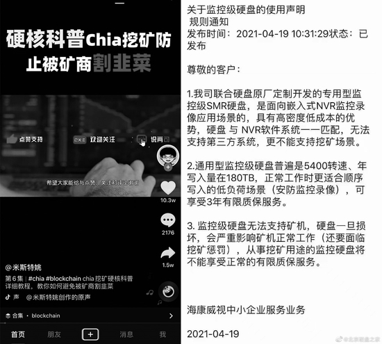 这一说法从某些层面也得到了印证,在抖音上,一个介绍 Chia 硬盘挖矿的视频,轻轻松松获得 了 10 万点赞;百度指数上,Chia 的关键词搜索量自 4 月份开始突破剧烈上升;朋友圈里曾经拉人头做社区的人开始说要组团挖 Chia;就连市值 5000 亿的 A 股上市公司海康威视也发表声明,其监控级硬盘不适用于挖矿使用。
