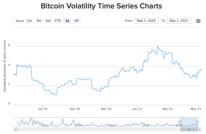 比特币的价格波动率是衡量资产价格波动程度的指标。2020年的大部分时间,比特币的价格波动率都在2.5%左右徘徊。然而,自牛市以来,该指数已开始攀升,在今年3月和4月最高达到了6%。