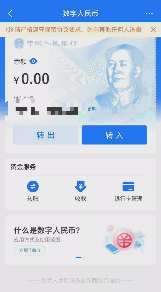 像上面新闻中提到的,数字人民币的钱包内嵌在支付宝里面,也可以内嵌在各种银行账户里面,未来也可能出现数字人民币的专用钱包APP,有了钱包地址就能转入转出数字人民币。