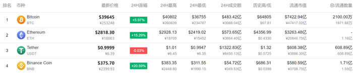 截至发稿,比特币兑美元日内涨幅5.97%,报39645美元/枚,币价一日涨超2000美元。