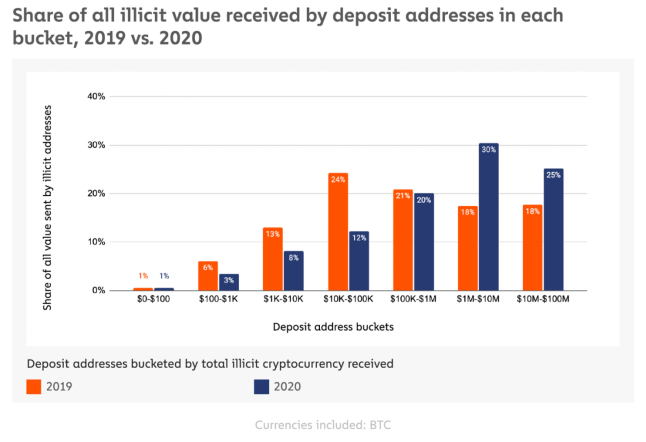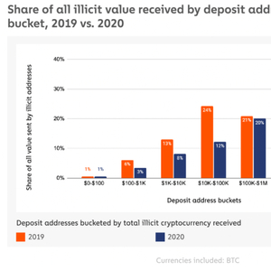 据腾讯安全战略研究院统计,裁判文书网公布的国内与虚拟货币相关的洗钱案件,2019年为25件,2020年案件量达到84件,而2021年一季度就达到了29件,超过2019年全年数量。相较于2019年,2020年转入非法资金的比特币地址越来越多,而每笔价值金额千万美元甚至上亿美元的占比也有所上升,也就是说,2019、2020年每年转入非法资金的比特币地址有数十亿美元。