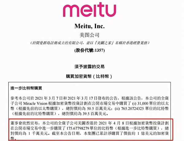 以被大家所熟知的,港股的美图为例来说明。美图公司公开的公告内容显示,美图公司累计持有的加密货币达到了1亿美元,其购买比特币时的平均价格为5.26万美元。而在此次大幅下跌中,比特币曾一度降至2.6万美元,如果按照这个标准来看,美图在比特币上的投资足足损失了一半。