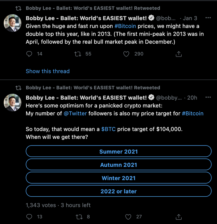 李启元则在推特表示,他依然坚持自己的观点:与2013年一样,比特币今年将会出现双顶,第一次在4月,第二次在12月。而他的孪生兄弟“逃顶之王”李启威也在近日的采访中表示目前依旧处于牛市,只是市场的大回调。