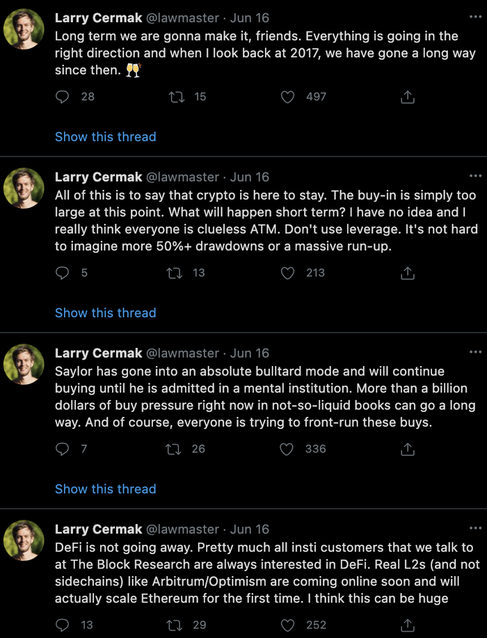 长期看多的还有The block的研究总监Larry Cermak,他表示,尽管其不是交易员,也不能判断当前是否已经进入熊市,但是目前加密领域的大趋势是正确的,DeFi也将蓬勃发展。
