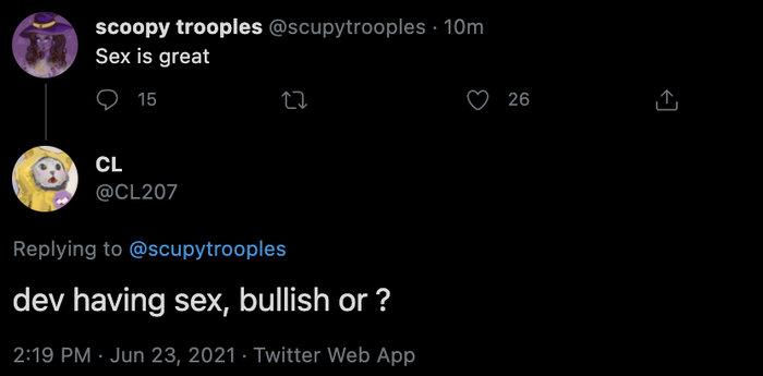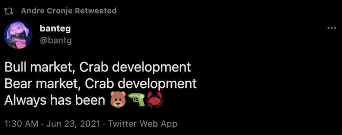 Yearn的核心开发者banteg也发表了对于近几周行情波动的看法。他自嘲道:“无论是牛市还是熊市,我们的开发速度都像螃蟹一样慢。” 推特发出后,Yearn的创始人Andre Cronje也第一时间点了赞。