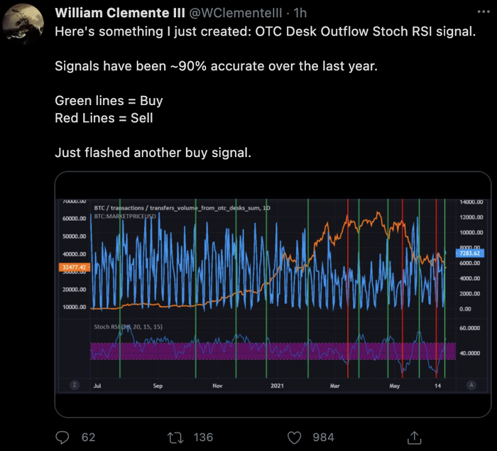 而量化分析师Willy Woo则直接甩出了数据称,根据Glassnode提供的已花费的输出利润率SOPR(Spent Output Profit Ratio)显示,比特币的的确确是进入了回调的时期,目前也是抄底的时候(Buy the dip)。