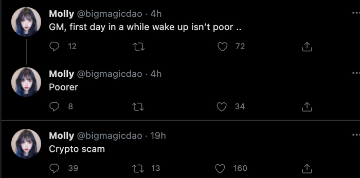 而我们的加密网红Molly小姐姐则是完全找不到了北,不过与我们一样,她肯定也希望牛市的下半场继续。
