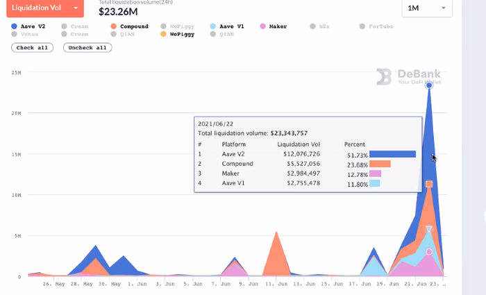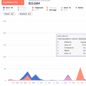 据不完全统计,过去24小时,DeFi协议中有超过2500万美元被清算,是前一天的7倍之多。