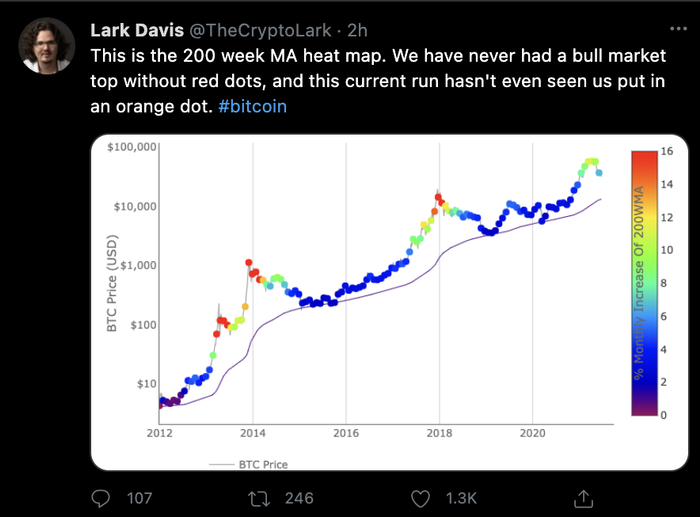 分析师Lark Davis也图文并茂的表示,从200周均线来看,市场绝对不会在没有达到下图热区的时候达到牛市顶峰。