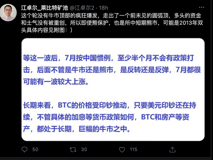 相反的是,由于国内对于比特币挖矿、交易等监管政策的收紧,部分国内的KOL们态度相对悲观。