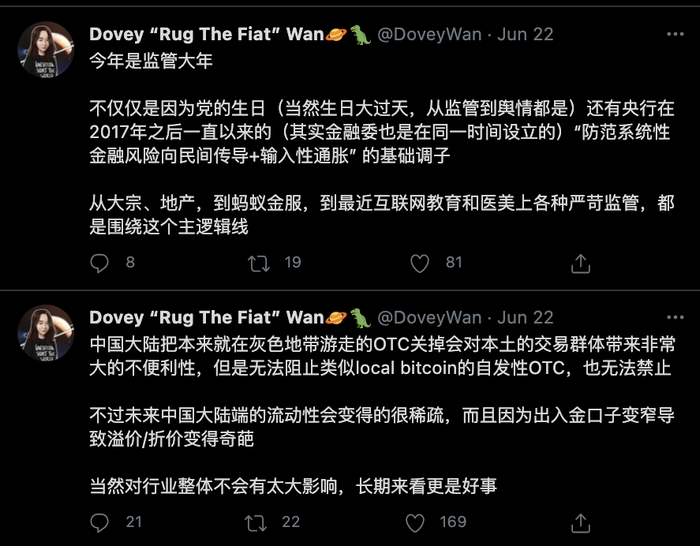 比如Dovey万近期就一直频繁的更新关于国内的监管动作与分析,她对于本次监管利空在短期内持有严重悲观的态度,但长期看好。
