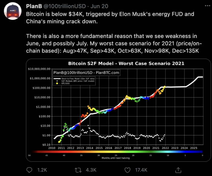 而根据其一直推崇的S2F(Stock-to-flow)模型,他判断比特币将在2021年第四季度迎来暴涨,最终达到13.5万美元。