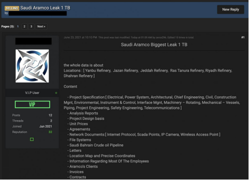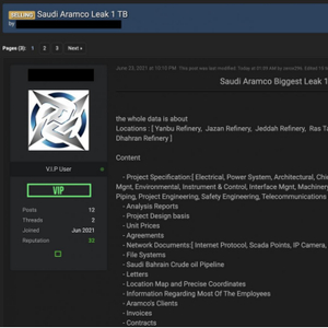 ZeroX声称,这些数据是在2020年某个时候通过入侵沙特阿美的网络和服务器盗来的。被盗文件最近的来自2020年,还有一些则可以追溯到1993年。