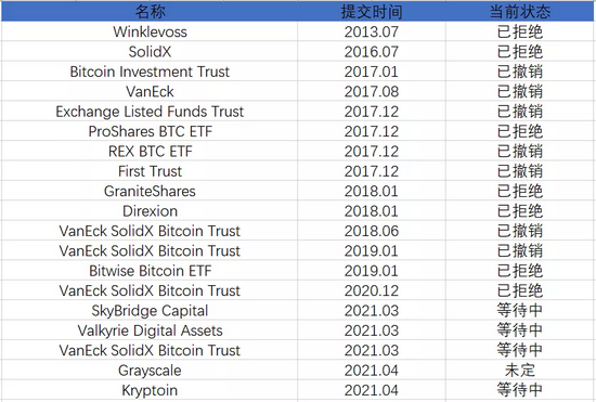 (美国)比特币ETF申请不完全统计(2013-2021.04)