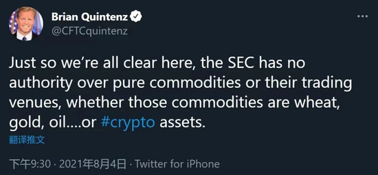 不过颇有意思的是,就在昨天,美国商品期货交易委员会(CFTC)专员 Brian Quintenz 则直接发推称,美国证券交易委员会(SEC)对纯商品及其交易场所没有监管权,无论这些商品是小麦、黄金、石油还是商品属性的加密资产等等。