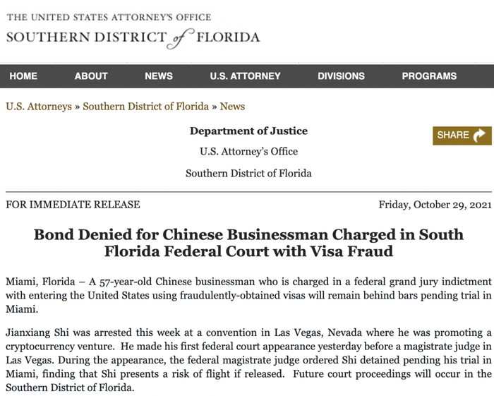 根据起诉书,Jianxiang Shi在2016年通过欺骗从而持有两张非移民签证,在两份申请中都表示他从未使用过另一个名字,他有一个名为“Long Niu”的假身份和旅行证件。检察官表示,施建祥在2017年2月使用“Long Niu”身份的旅行证件进入美国,自离开中国以来一直以“Morgan Shi”的身份居住在加利福尼亚和内华达州。年龄及姓名均与匿迹的快鹿原董事长施建祥一致。
