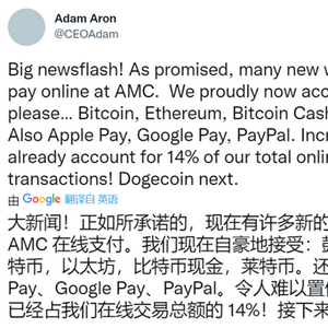 另一边,美国最大院线运营商AMC娱乐控股的CEO亚当·艾伦周四也宣布,该公司现在开始接受四种加密货币——比特币、以太坊、比特币现金和莱特币——支付,下一步将推出狗狗币支付。