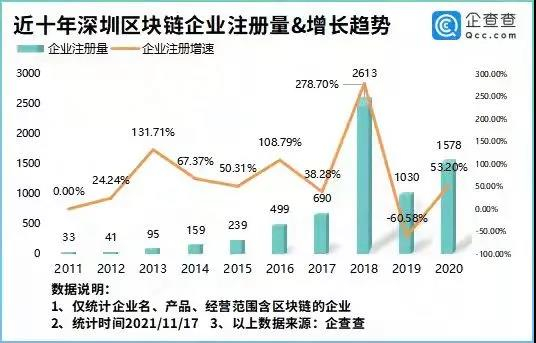 深圳很早就开始探索区块链技术,据企查查显示,早在2010年,深圳市便注册了11家区块链相关的公司。此后,区块链企业注册数量快速增长,2018年增长速度达到峰值,一年新增了2613家区块链企业。