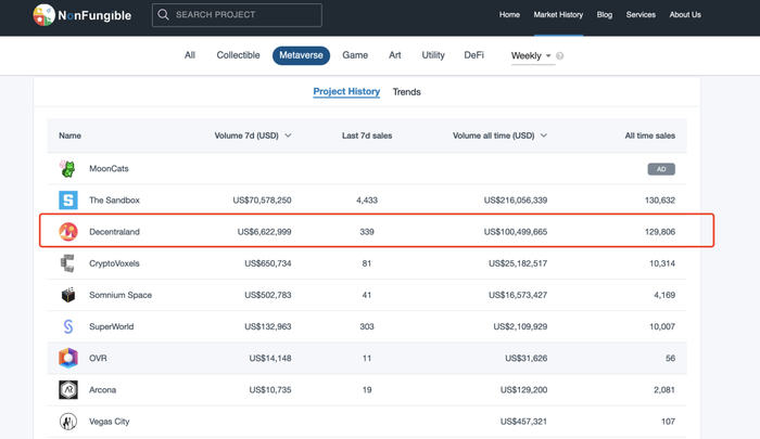 截至发稿,Decentraland总交易量已逾1亿美元,七日交易量约662万美元,Sandbox的交易量已逾2亿美元,七日交易量约7000万美元,两者的交易量远远领先其他Metaverse项目。