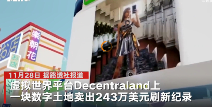 11月25日,在Decentraland中一块虚拟土地被Tokens.com公司以243万美元的天价(约合1550万元左右)拍下,并创下当时虚拟房产价格的历史新高。