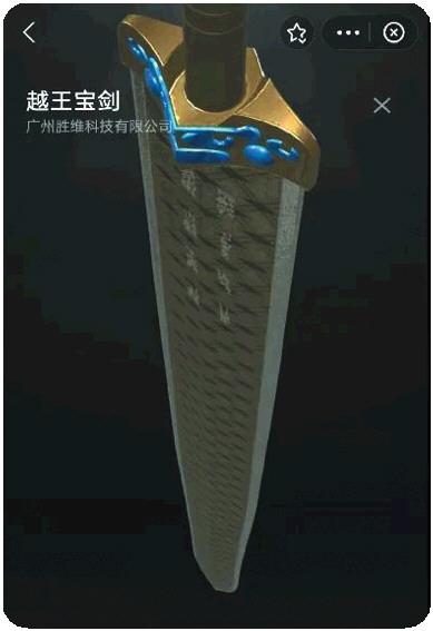 作为数字藏品,每一把虚拟的“越王勾践剑”都有自己专属的收藏编号。在支付宝小程序的3D“越王勾践剑”界面里,该藏品栩栩如生,剑上的纹路、宝石、刻字非常清晰。