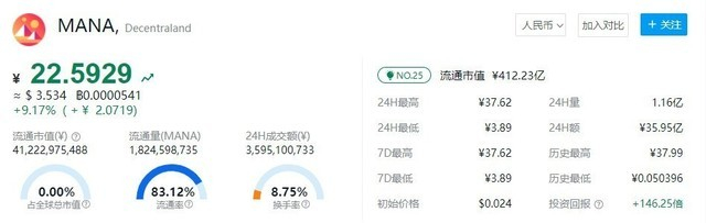 虽然元宇宙概念被大众广为人知还没几个月的时间,但以Decentraland平台为例,它的出现已经有4年的时间,而且平台里用以交易的货币MANA也已经从0.05元涨到了37.99元,价格翻了760倍