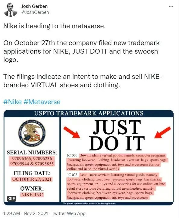早在11月3日,耐克已向美国专利及商标局提交‘NIKE’、‘Just Do It’等多项商标申请,商标用途表示可用于下载虚拟物品,包括具有电脑编程特性的鞋、衣服、头饰等产品。