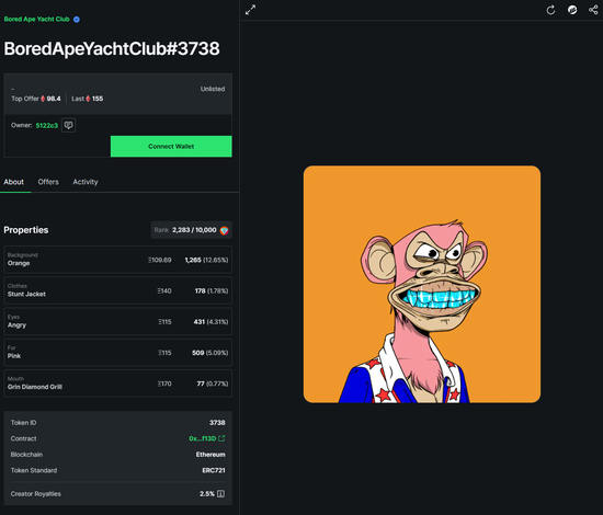 4月2日,贝壳财经记者搜索发现,周杰伦被盗的BAYC #3738在OpenSea交易平台上并未显示售价和历史交易记录,疑似已被封锁;不过,该NFT成功挂上了LooksRare交易平台,截至4月2日8:28,最新交易价格为155ETH(约340.49万元人民币)。