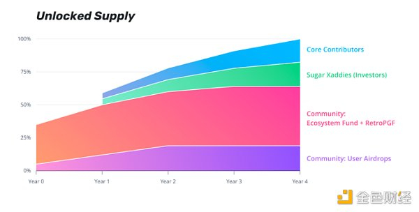 在创世时,初始总供应量为 4,294,967,296 个 OP 代币。代币总供应量将以每年 2% 的速度膨胀。64% 的初始代币供应(即不为核心贡献者或糖粉保留的 OP 总量)将如上所述分配给社区。随着时间的推移,这些分配将由 Optimism Foundation 作为 Optimism Collective 的管理者进行管理。