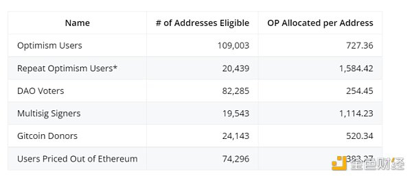 Optimism Foundation 官方指出:我们的空投有六套标准。两个针对早期采用者和活跃项目用户的 Optimism 用户,四个针对 L1 以太坊,针对积极贡献、正和行为和积极参与。每个集合都是不同的,这意味着一个地址可以有资格获得多个并相应地分配一定数量的代币。地址快照于 2022 年 3 月 25 日 0:00 UTC 拍摄。分配和标准细分如下: