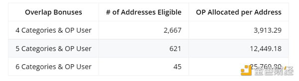 符合多个以太坊标准的早期 Optimism 用户最有可能成为 Optimism 生态系统的重要参与者,因此这些地址获得了额外的重叠奖励。