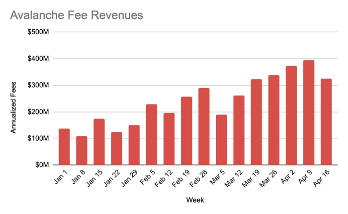 举个例子: Avalanche 近期网络手续费消耗速度达到年初的 3 倍(照此速度,一年约消耗 4 亿美元),成为仅次于以太坊和币安智能链的第三大区块链。这里面发生了什么?