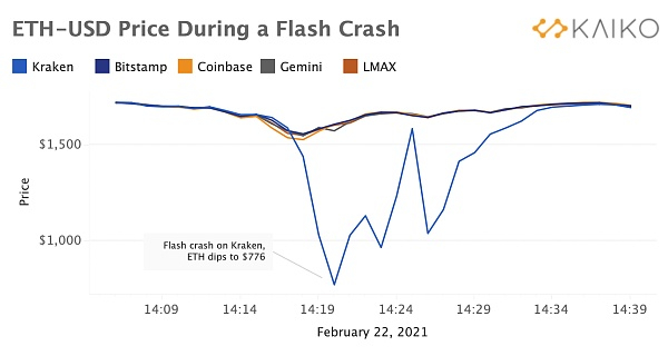 在极端情况下,由于资产服务平台停牌、闪电崩盘、动荡市场事件或(最坏情况下)市场操纵,加密资产的价格可能在不同市场之间出现显著差异。这就是为什么确定加密资产的“好”价格一直是一项需要大量的方法来选择和过滤数据的复杂的任务。2021年2月22日,由于巨大的抛售压力,Kraken的以太坊-美元交易对经历了突然的闪电崩盘。从上一分钟到下一分钟,以太坊的价格从1,500美元跌至仅776美元,大约十分钟后恢复回升。