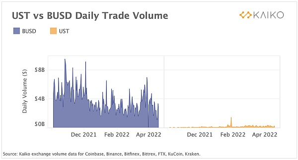 上周,按市值计算,US Terra以约180亿美元的市值成为第三大稳定币,超过了币安的BUSD(以参考为例,最大的稳定币 USDT和USDC的市值分别为830亿美元和500亿美元)。尽管市值较高,但UST在集中资产服务平台的日交易量明显低于BUSD,后者约为40亿美元,而BUSD约为1.4亿美元。