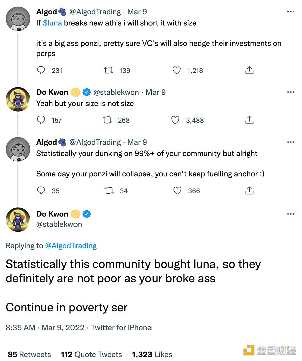 尽管我们和许多其他人一样,公开评论了 UST 和 Terra 的不可持续性,但 Terra 对所有挑战置之不理。Do Kwon 在自己周围形成了一种个人崇拜,公开攻击反对者并驳斥不可持续的说法。